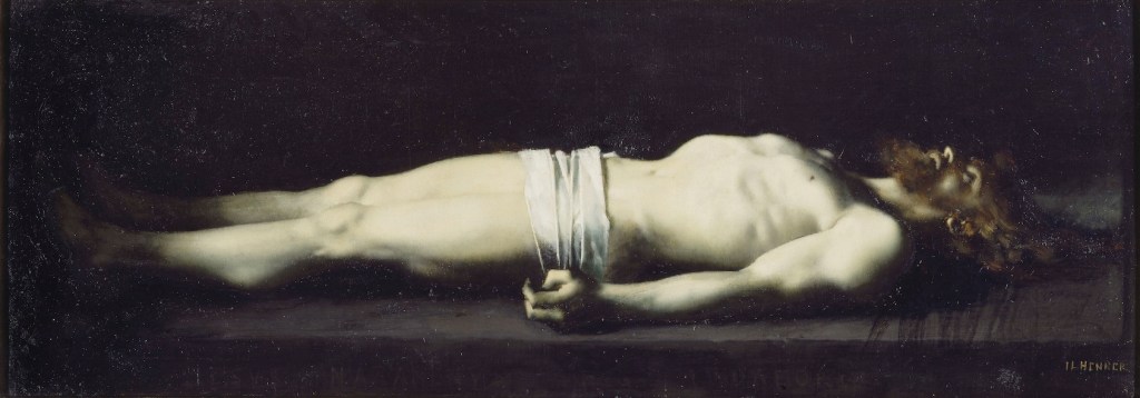 Le corps du Christ est enveloppé d’ombres qui font ressortir l’extrême pâleur de sa chair. Elles lui confèrent une présence fantomatique et sereine, si on le compare avec le Christ d’Holbein dont il est possible que Henner s’inspire. Il y a ici un vérisme paradoxal : les détails anatomiques sont extrêmement soignés, mais la lumière dans l’œuvre rappelle le corps à son destin mystique. Il ne s’agit pas tant de signifier les douleurs de la passion que de suggérer le caractère intermédiaire de cet état. Henner choisit donc de le représenter sans stigmates, en retranchant tout ce qui relève de son existence mondaine. À ce titre, les contours évanouissants sont bien une « promesse » au sens de Ravaisson : le mystère de la mort et de la résurrection est entrevu dans et par le caractère suggestif de la représentation. Sur le plan phénoménologique, c’est de l’incomplétude foncière de la perception dont il est question : l’apparition se produit par aspects, ou par esquisses. Henner parvient à donner à cette œuvre une dimension temporelle : le corps du Christ semble suspendu entre scène perçue de manière fugitive et vie éternelle.