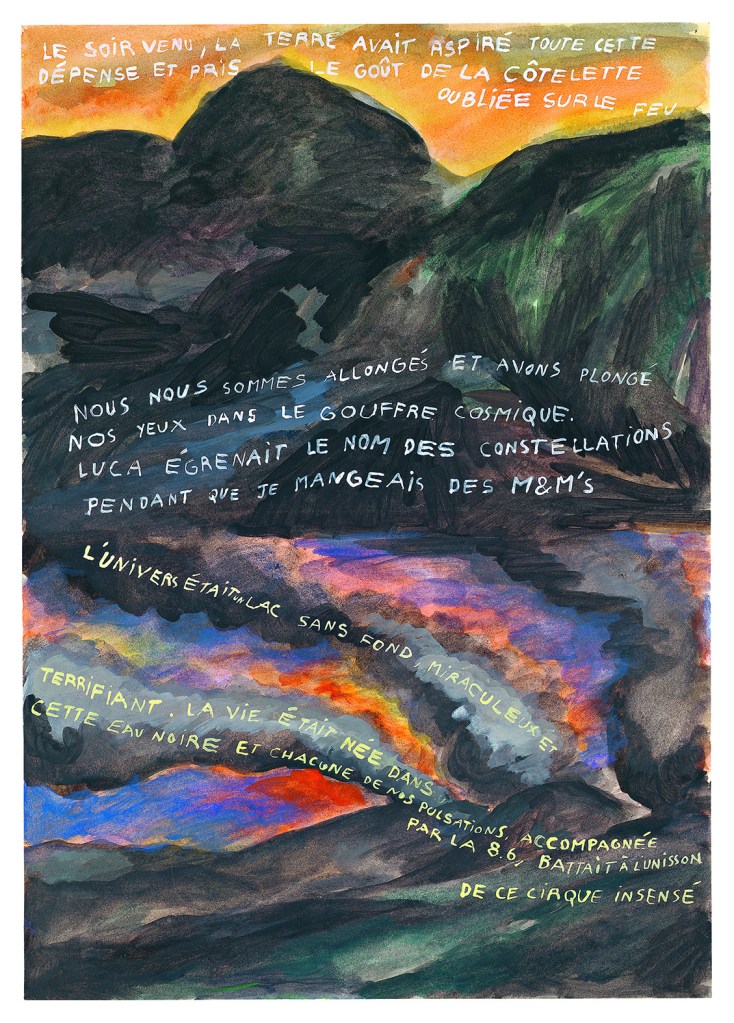 Quand je me lance dans un récit, je travaille beaucoup dans une sorte de semi improvisation, je ne m’intéresse pas à savoir comment et pourquoi les idées arrivent, quelle est la part autobiographique ou pas. Mon seul barème est d’être surpris et que quelque chose en moi trouve adhérence, puissamment et de manière pérenne.